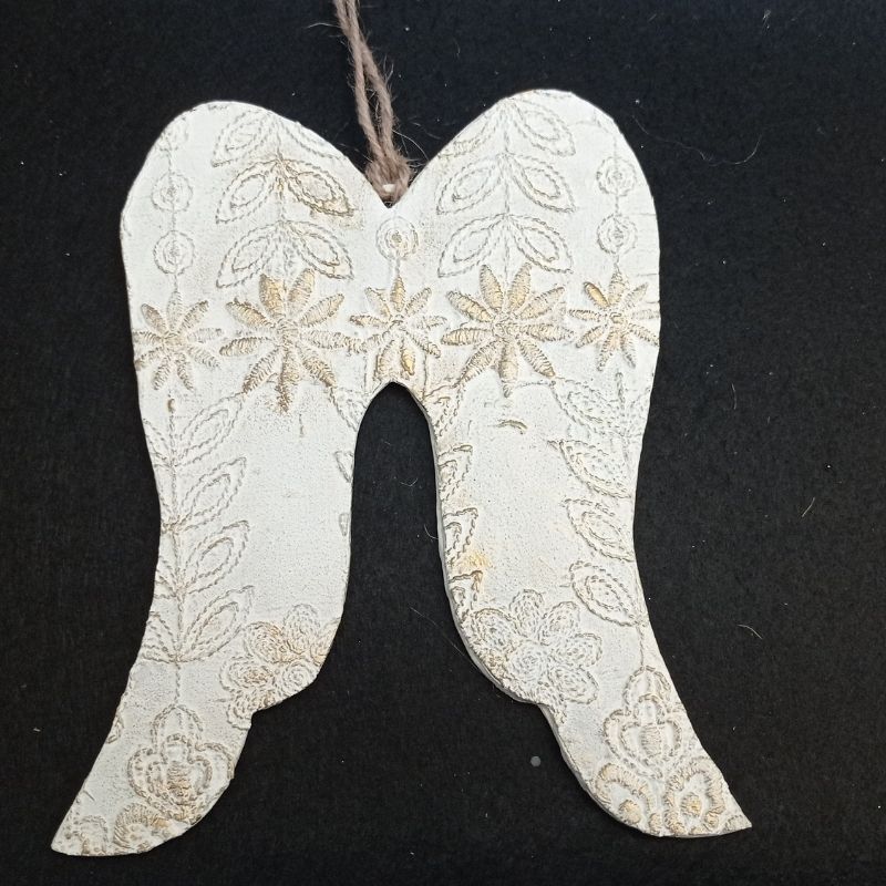 Alas de ángel con relieve de tela de flores pintada en color blanco antiguo a la tiza y patinado en oro.