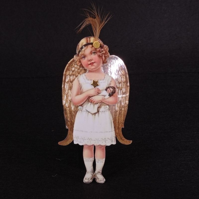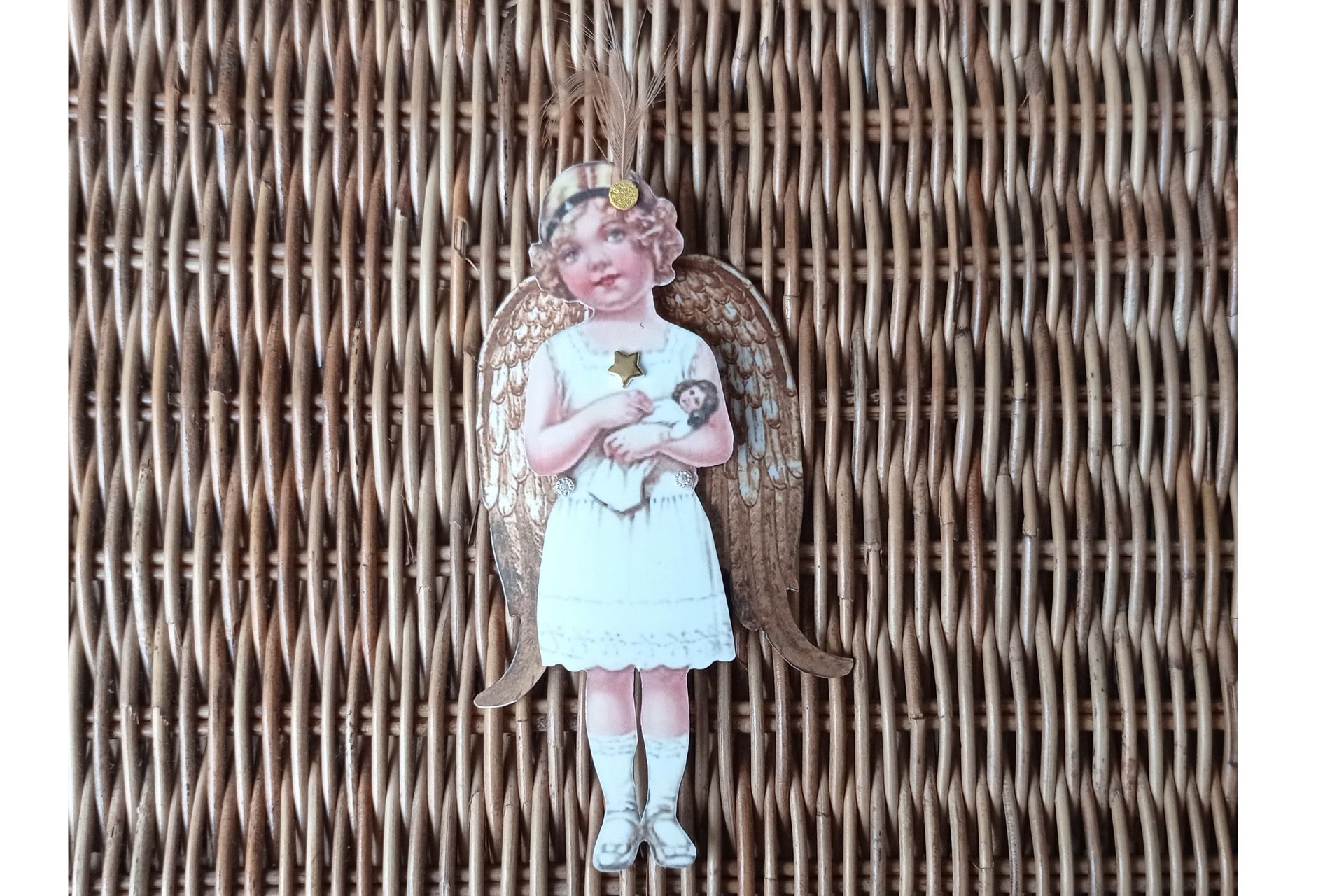 Ángel vintage de cartulina plastificada y alitas en relieve.