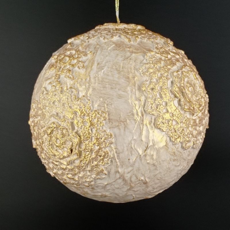 Bonita bola con papel mache y texturas de crochet en color beis y patina oro.