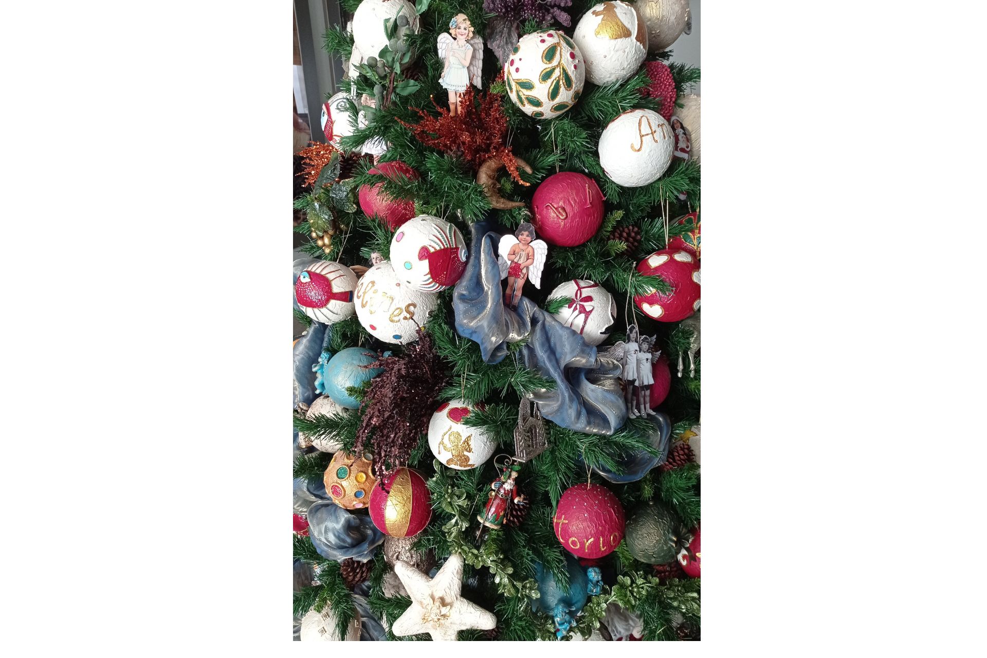 Esta bola esta hecha a mano con base de poliestileno y técnica de papel mache, con figuras en relieve y pintadas con acrílicos.
