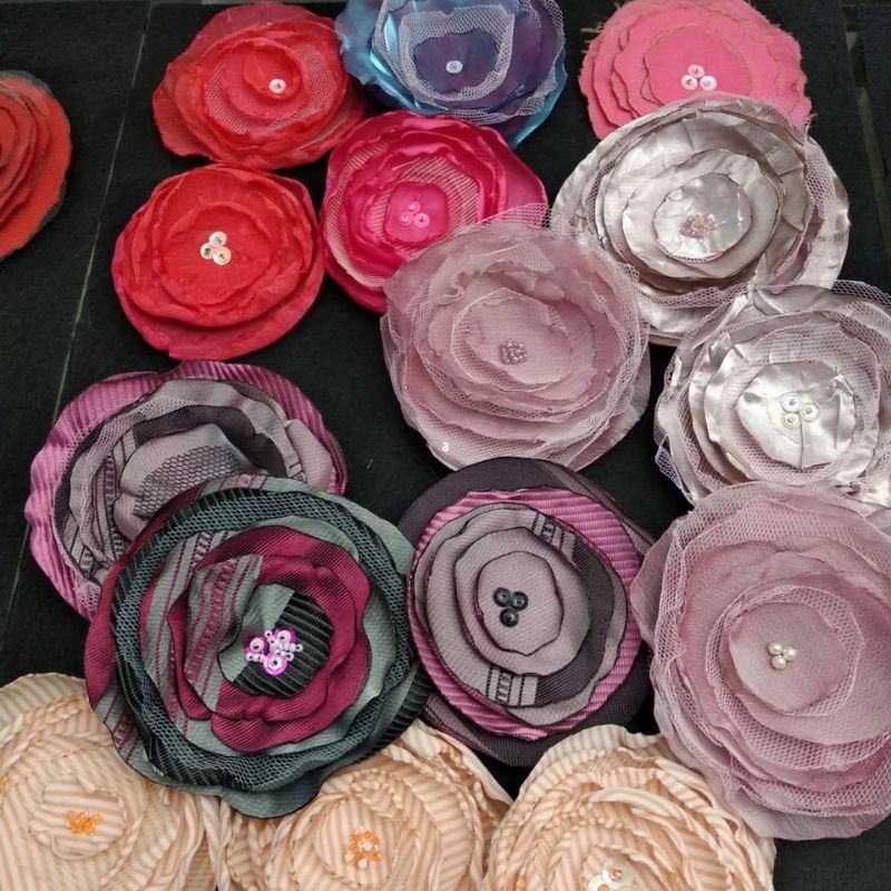 Bonita flor de diferentes telas, rizadas con calor y con broche por detrás, puede ir con imperdible o pinza.